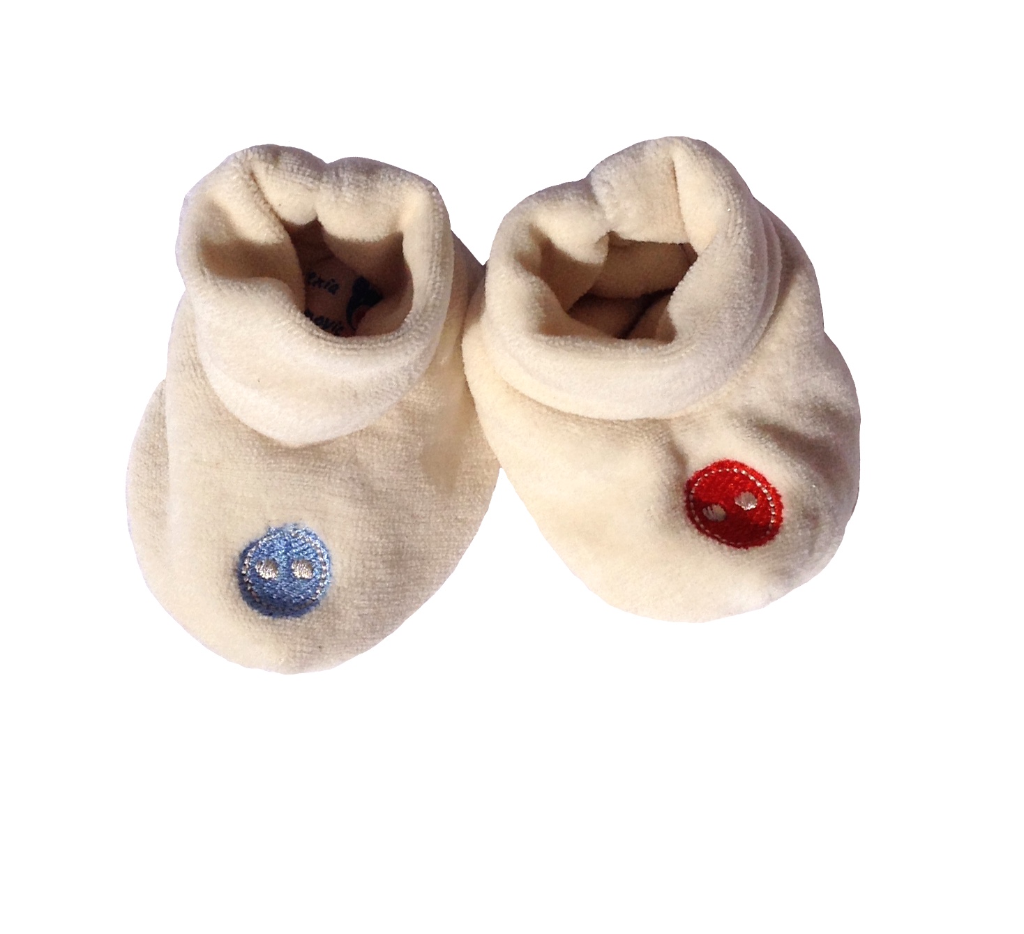 Petits chaussons en velours de coton biologique, avec boutons brodés, couleur velours naturelle, qualité certifiée GOTS, pour garder les pieds bébé bien au chaud dès sa naissance. Taille unique naissance.