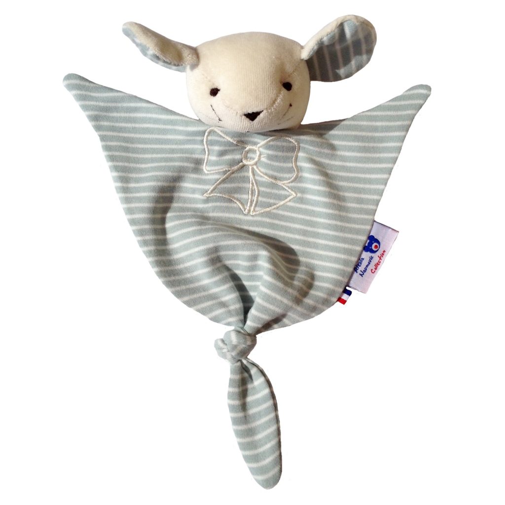 Souris en jersey rayé de coton biologique certifié GOTS. Couleur naturelle et vert, à offrir dès la naissance, pour fille ou garçon. Fabriquée 100% en région de Paris , pour un doudou éthique et durable facile à attraper par bébé.